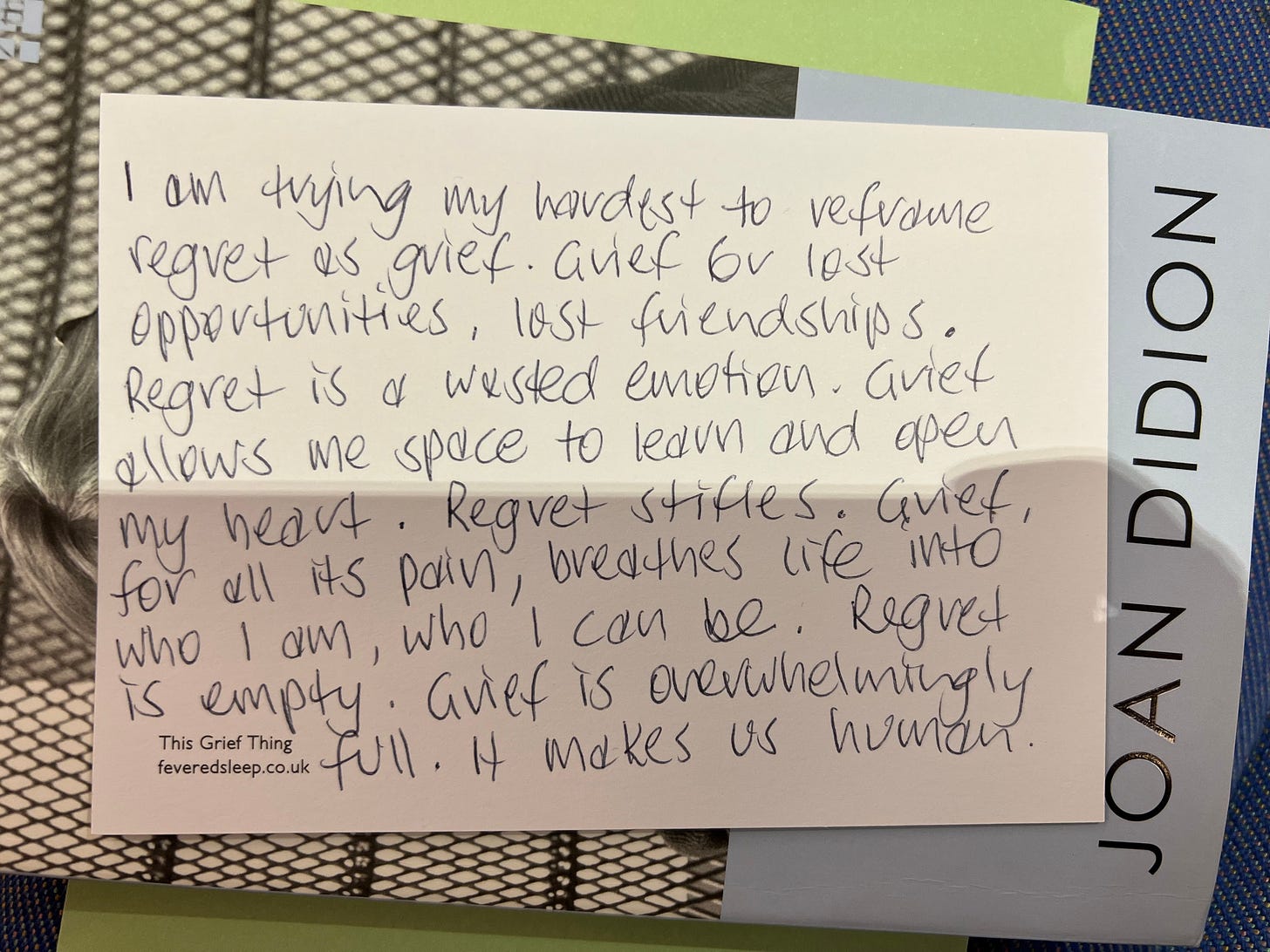 Great to read your teasing out the nuances between the terms here, as well! Feels like a cathartic distinction there between grief and regret - one we can all make good use of, no doubt.