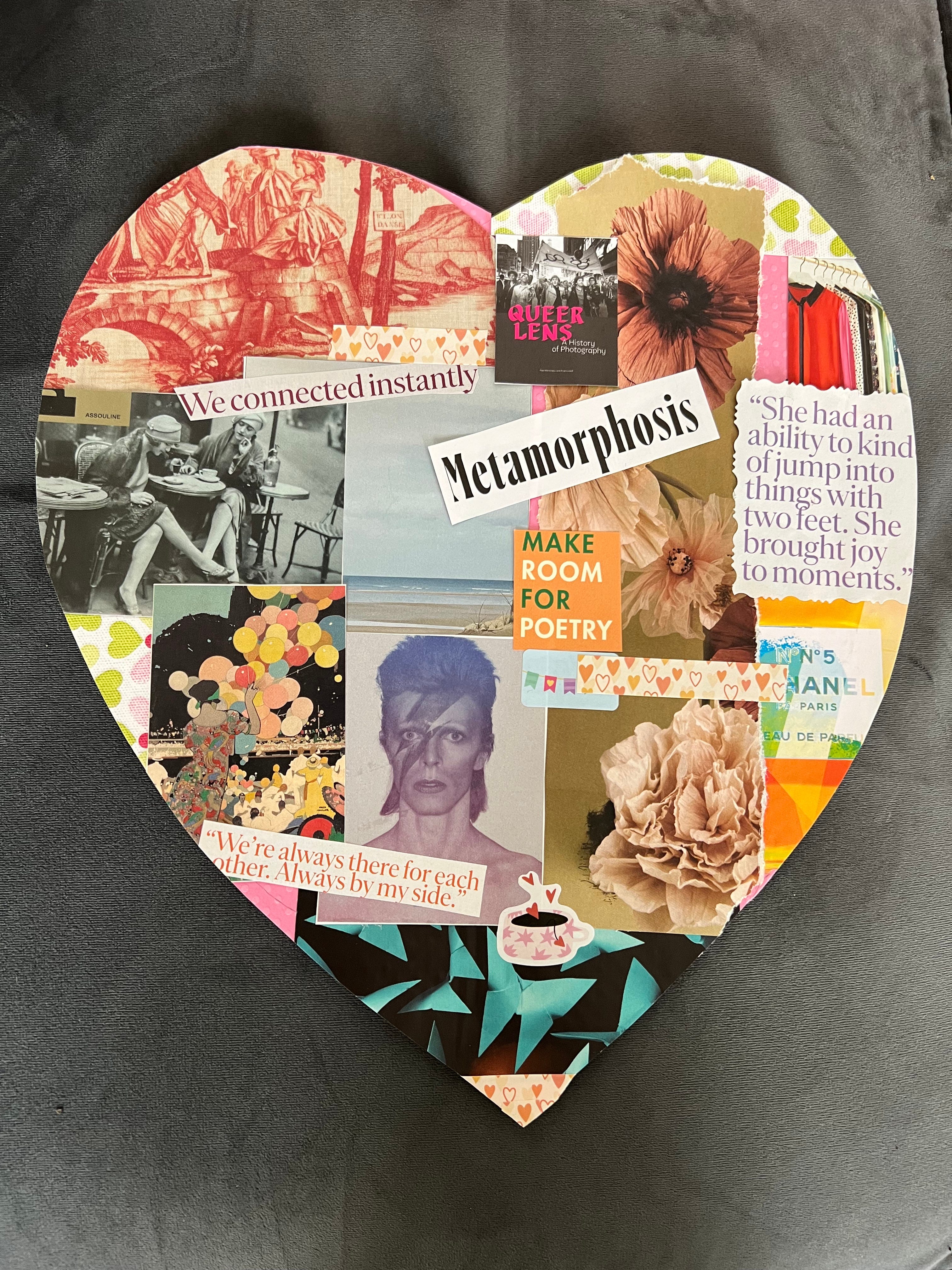 I had extensive plans for my collage – to start a visual journal for my novel. When it came to it, it was like my brain had hit the go-slow button. So I gave myself permission to just be. To flick through coloured paper and magazines and just see what came. I gathered pictures and words. A heart shape formed, and the friendship that’s at the heart of my book emerged.